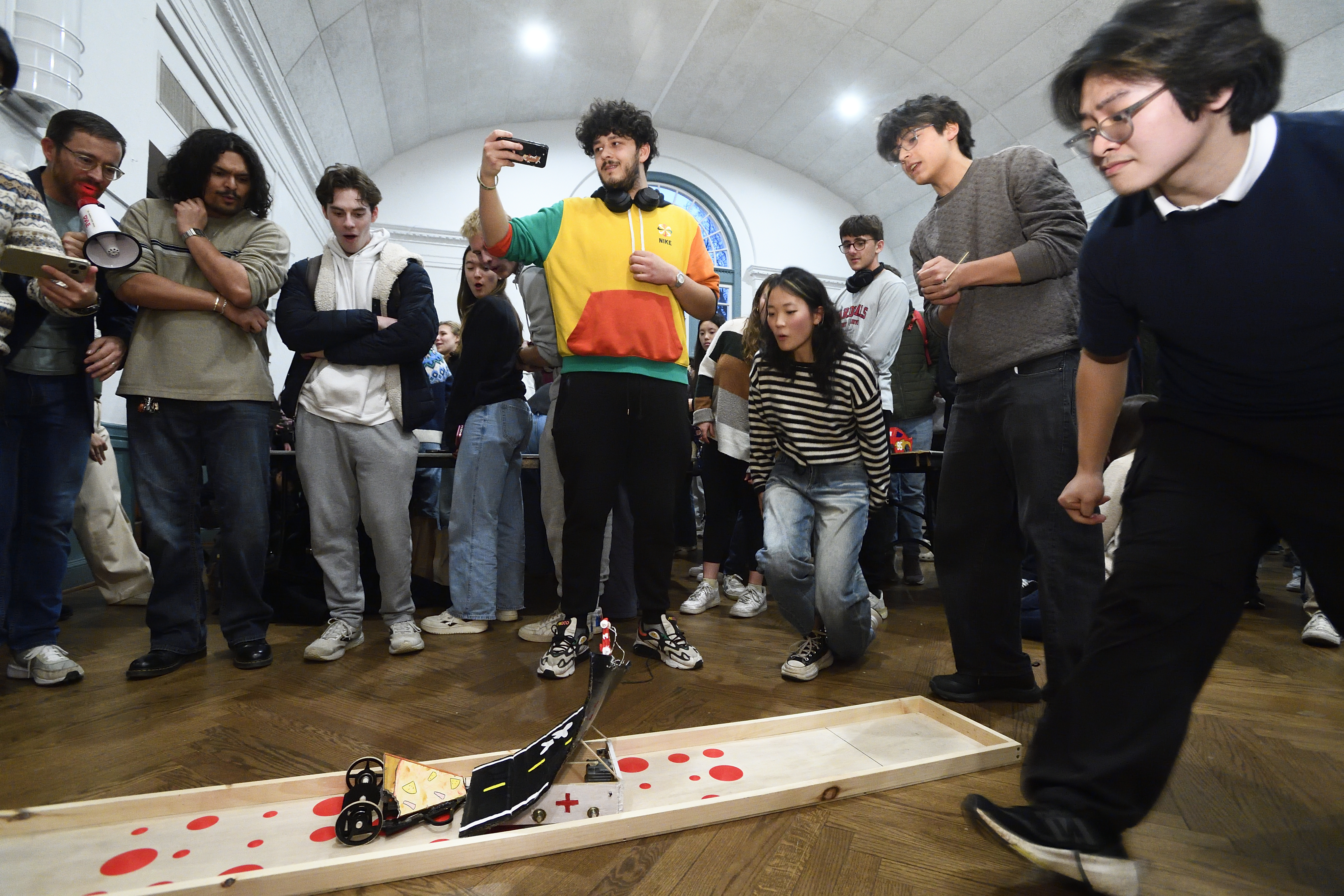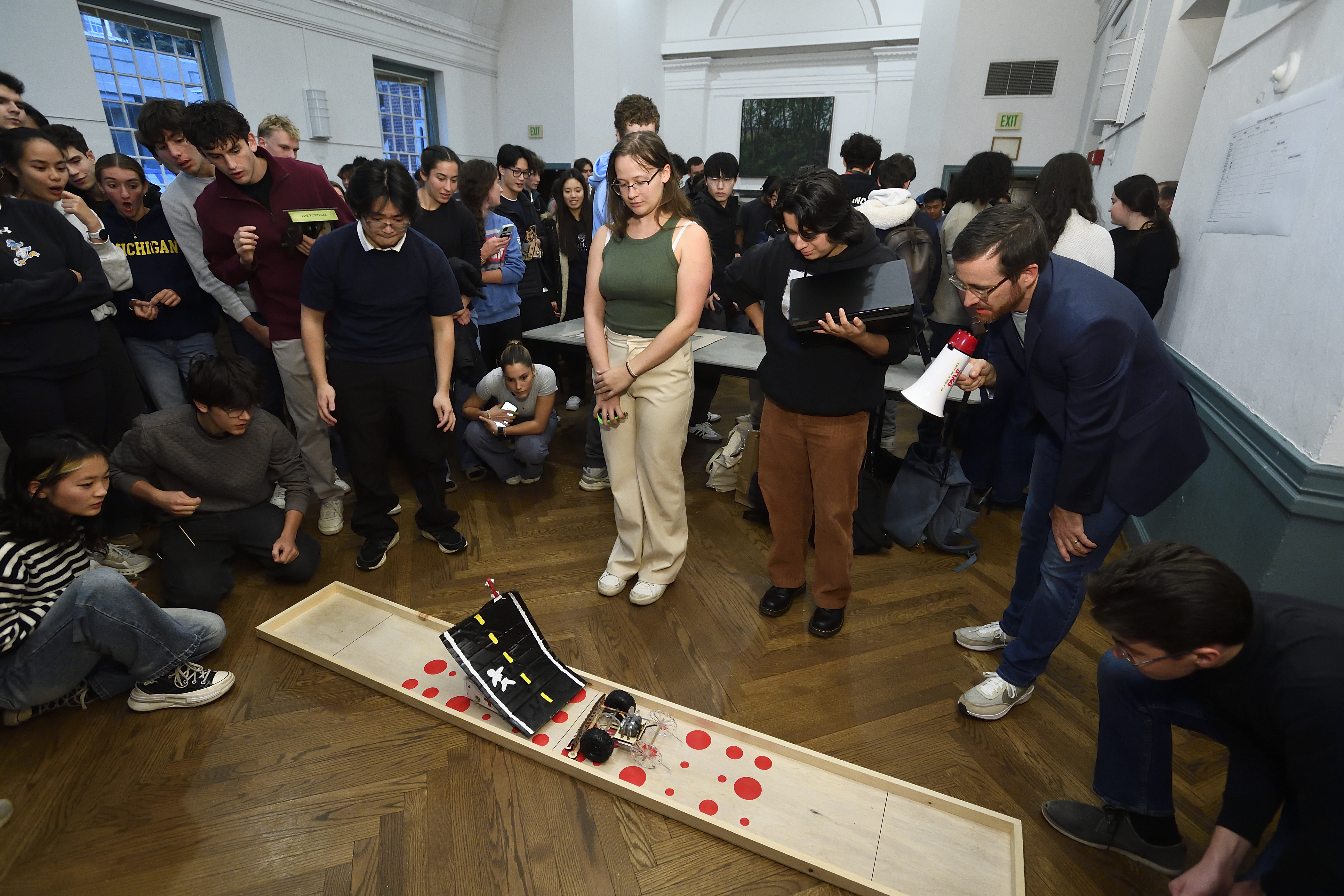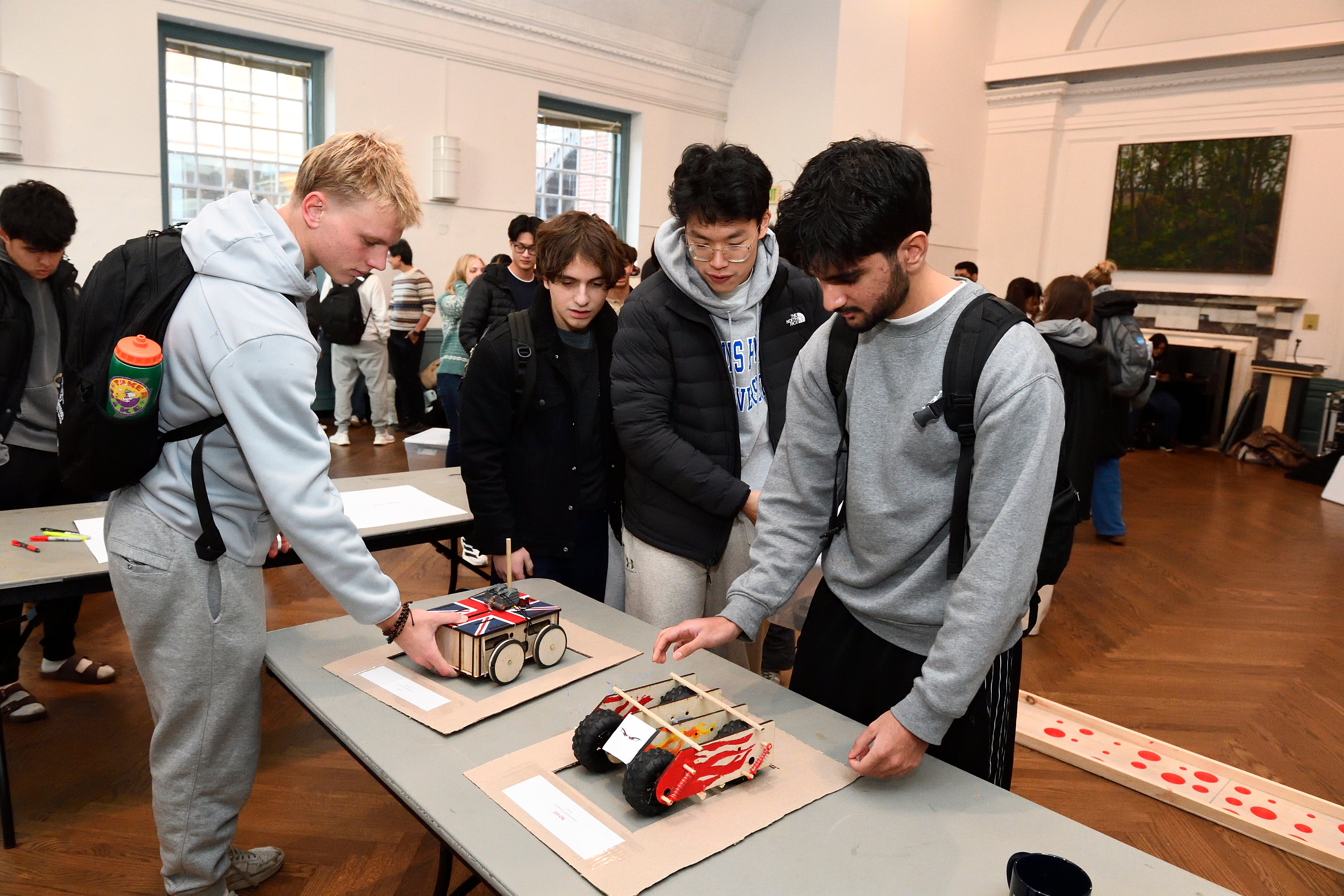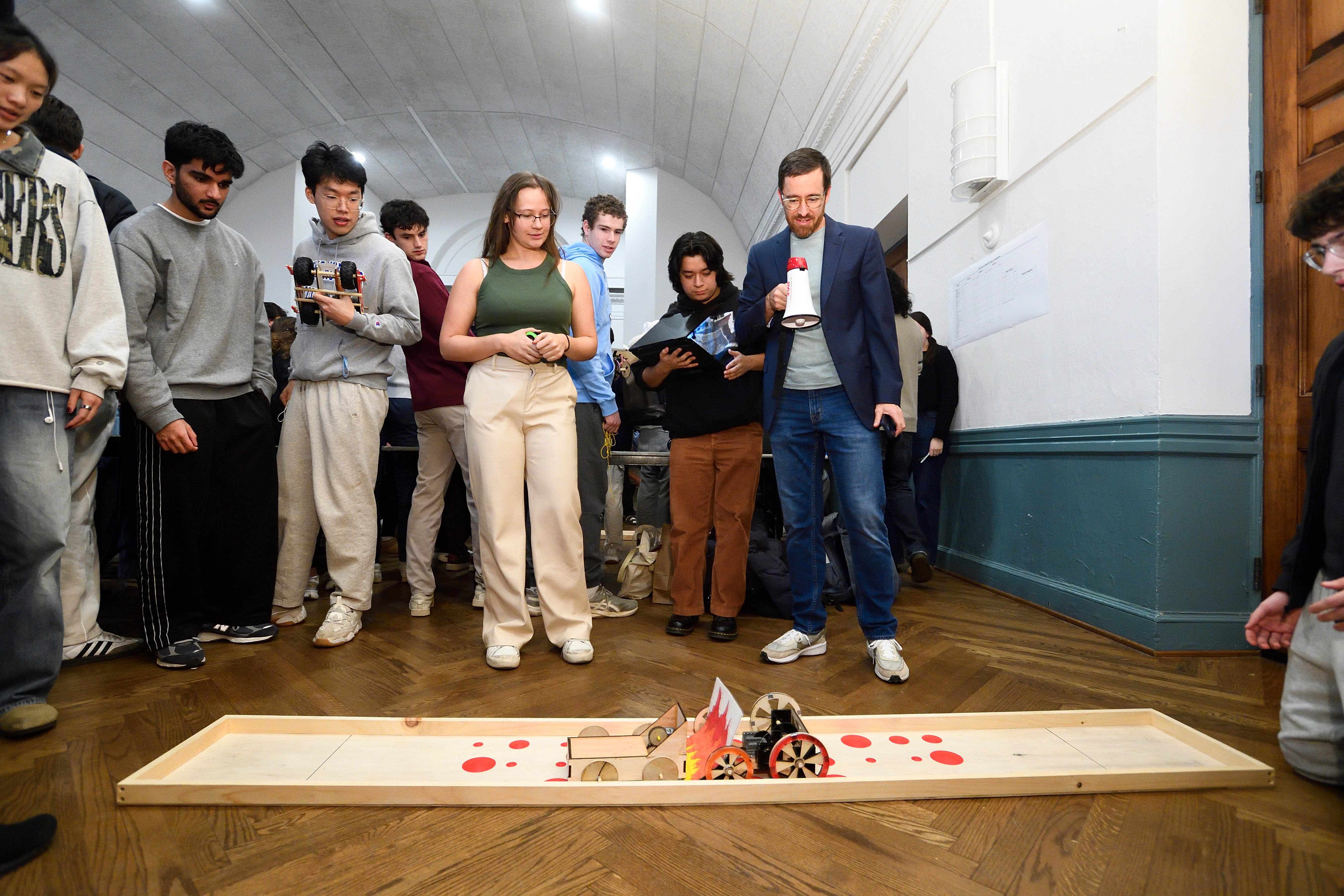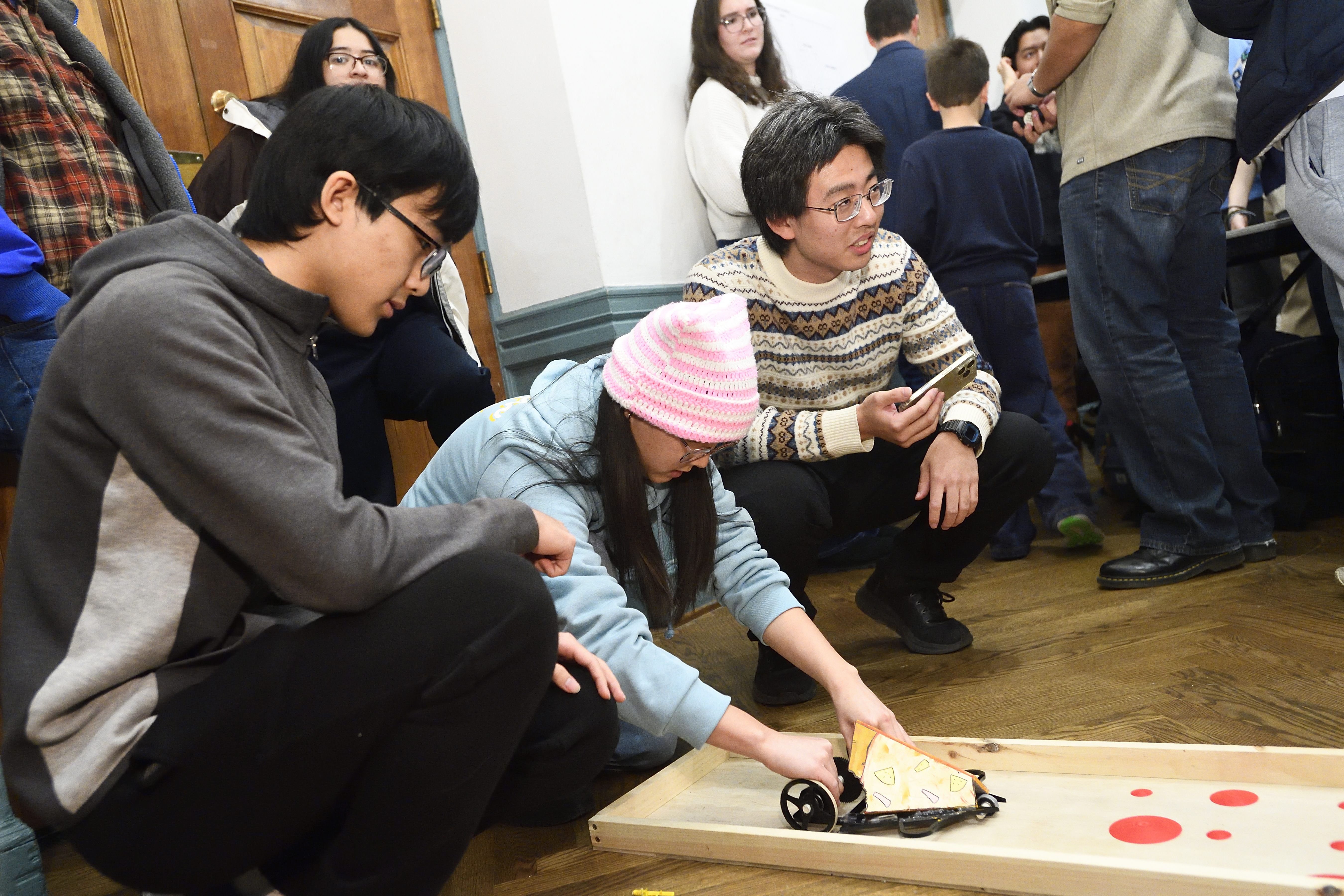 “We figured it was a matter of who got to the middle first, so we focused on maximizing torque and acceleration,” said team member Allison Chuang, who, along with teammates Christopher Yang and Jason Zhao, advanced through four levels of the competition bracket, defeating teams Tortoise and Sexy Subaru in the final round-robin match in front of a silent, standing-room crowd.