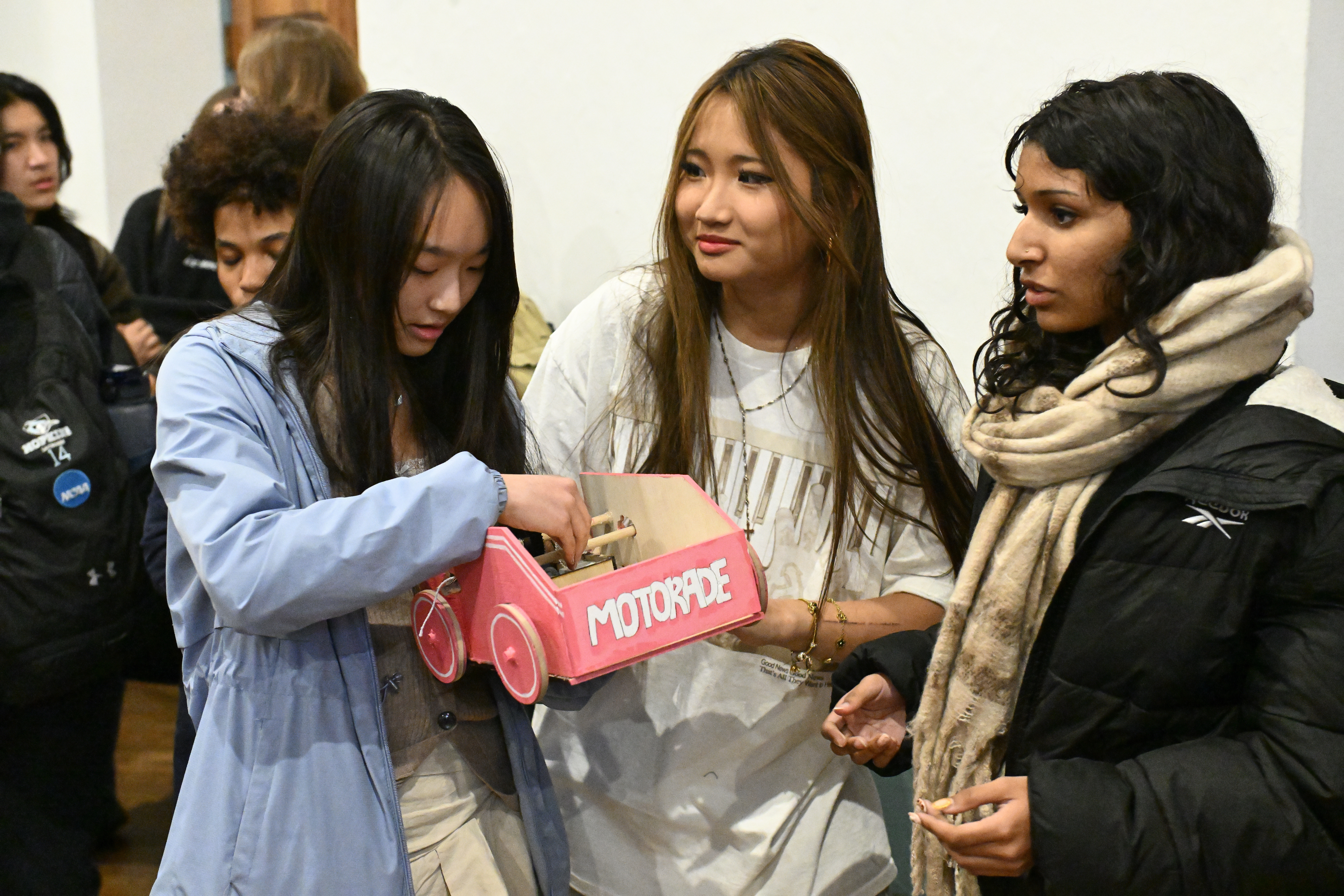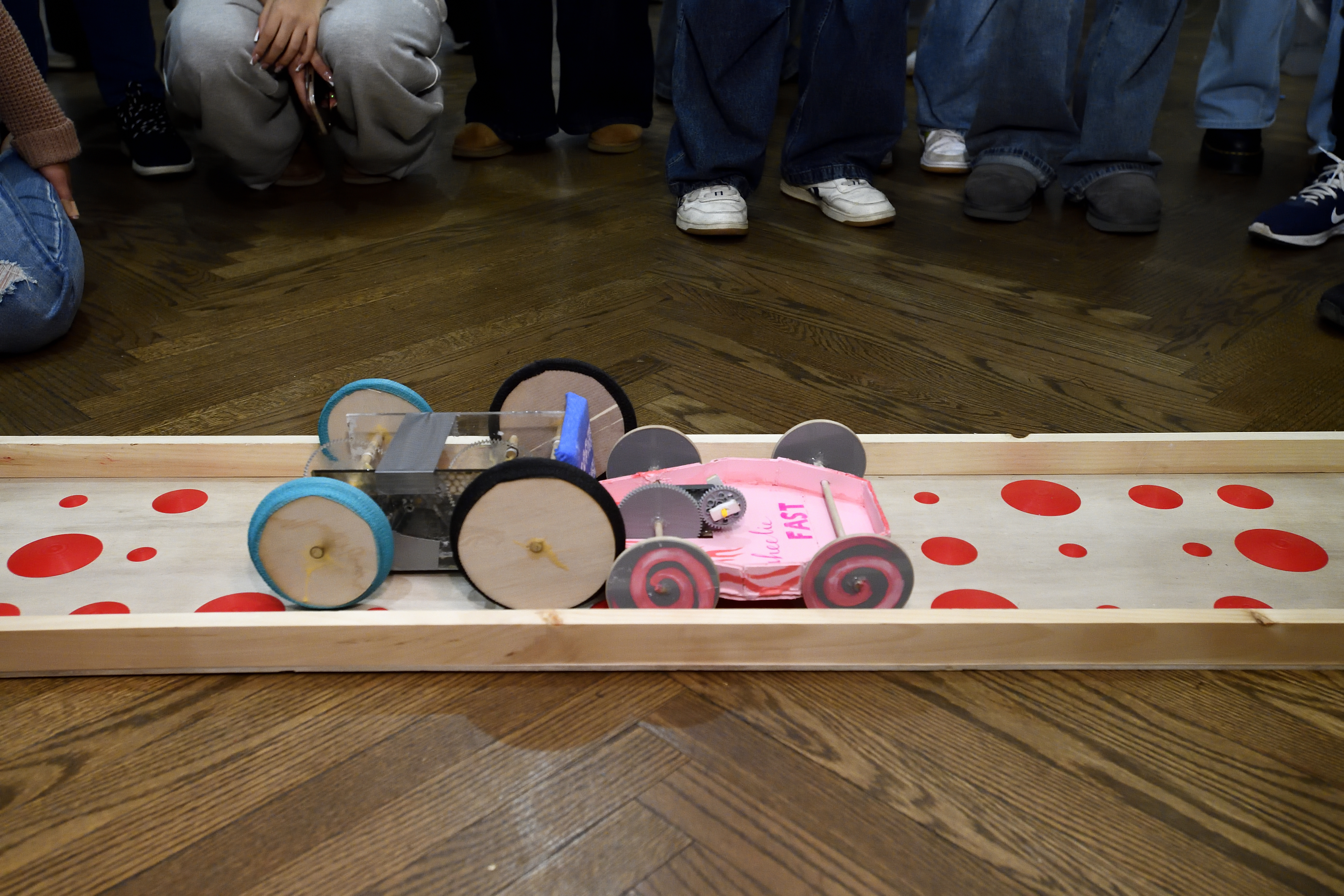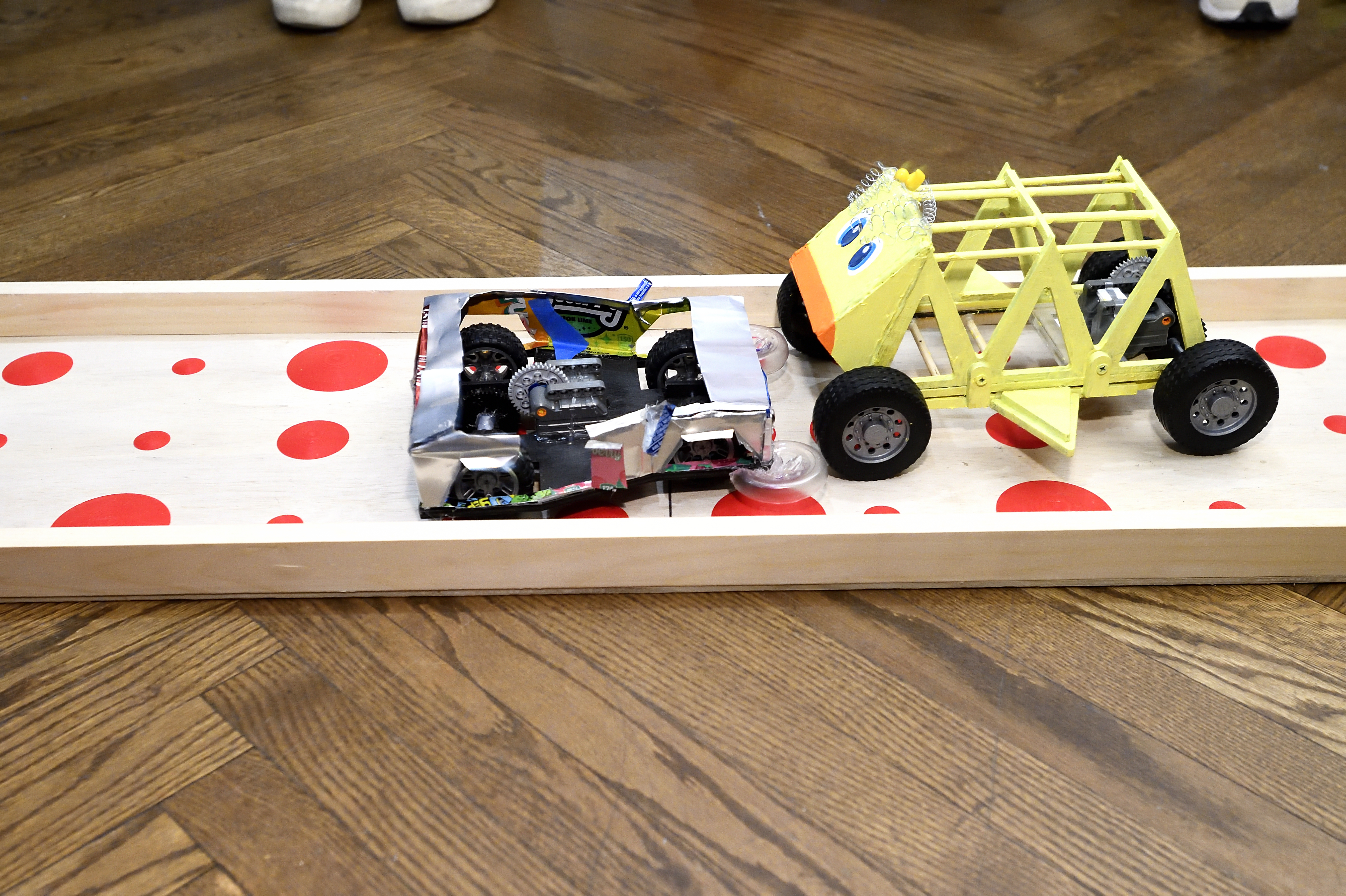 “We wanted to mimic an all-wheel drive car to retain traction,” said Savannah Cabrera, a member of team Lightning McQueens, noting that the track was littered with bumps. “Our plan was just to create something that functions properly.”