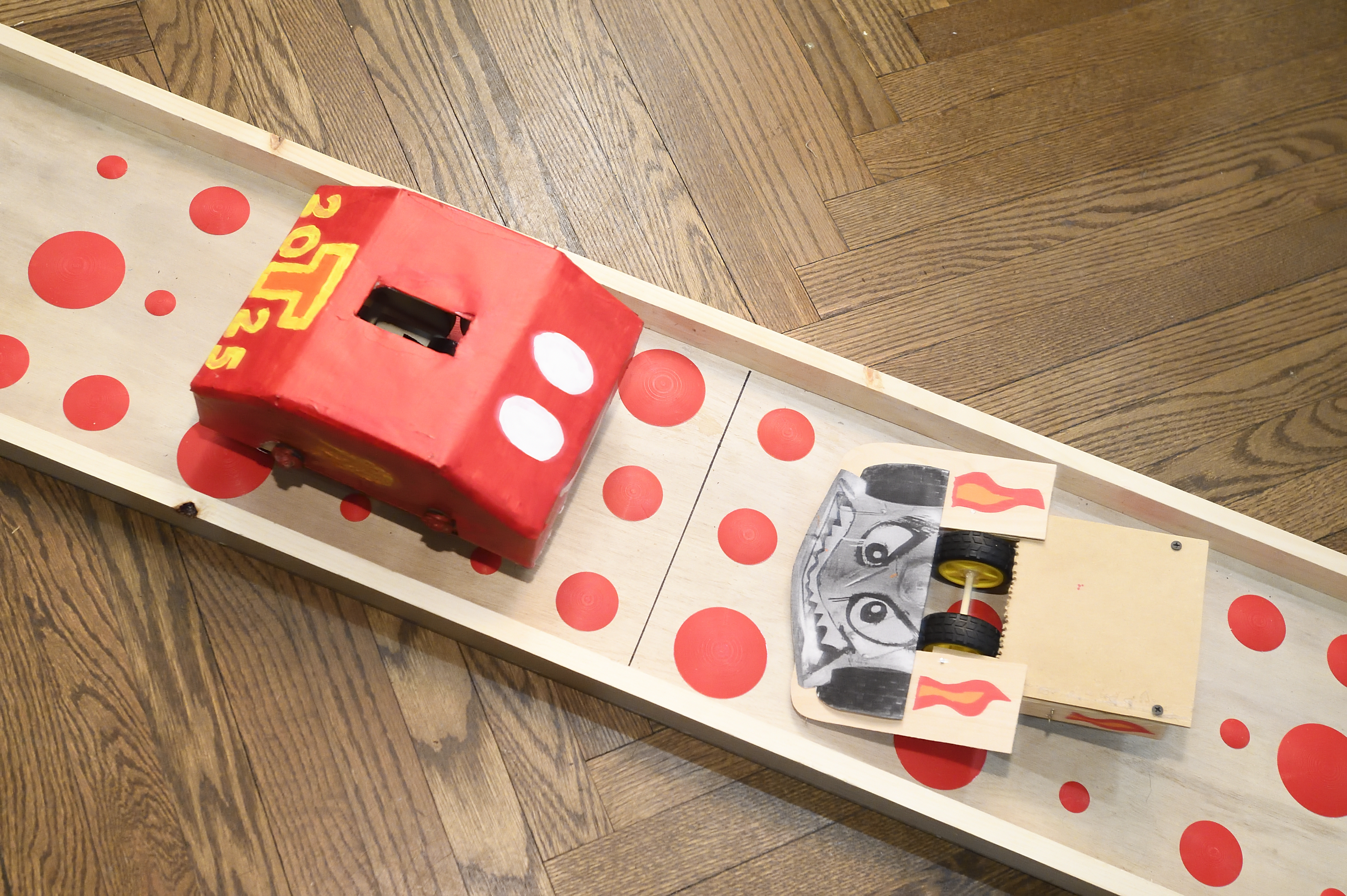 “If it flips over, it explodes,” she said, revealing the flames painted on the car’s undercarriage. “We can also change its expression depending on how we do,” she added, pointing out the frown drawn on the car’s front.