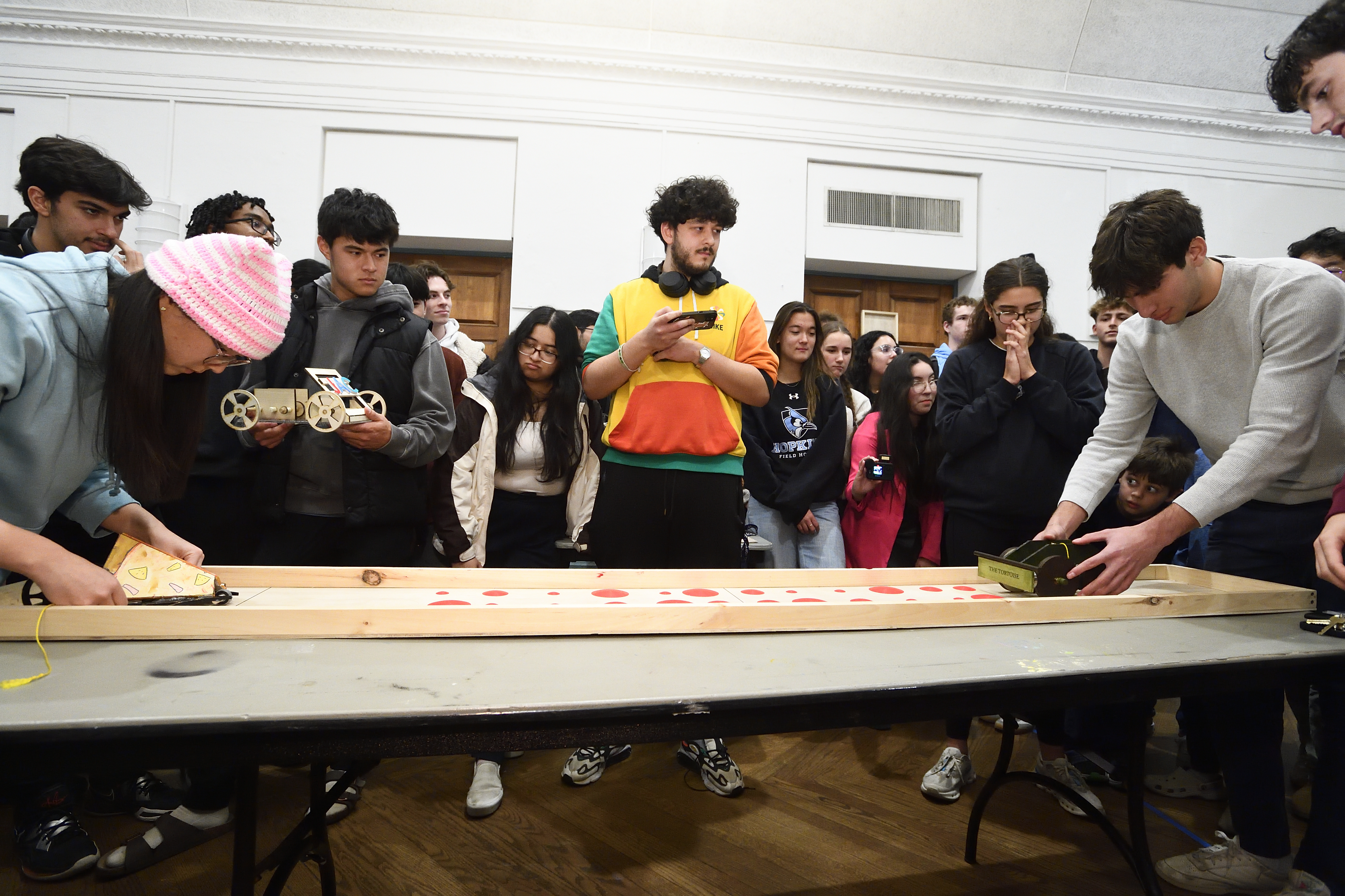 The classic paradox asks: What happens if an immoveable object meets an unstoppable force? On Wednesday night in Levering’s Great Hall, 34 teams of first-year mechanical engineering students turned that well-known question into a high-stakes contest during the annual Freshman Design Competition, the culmination of the Intro to MechE Design and CAD course.